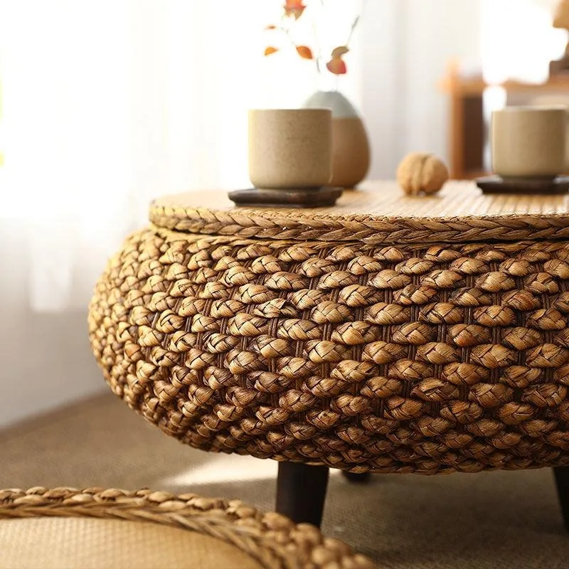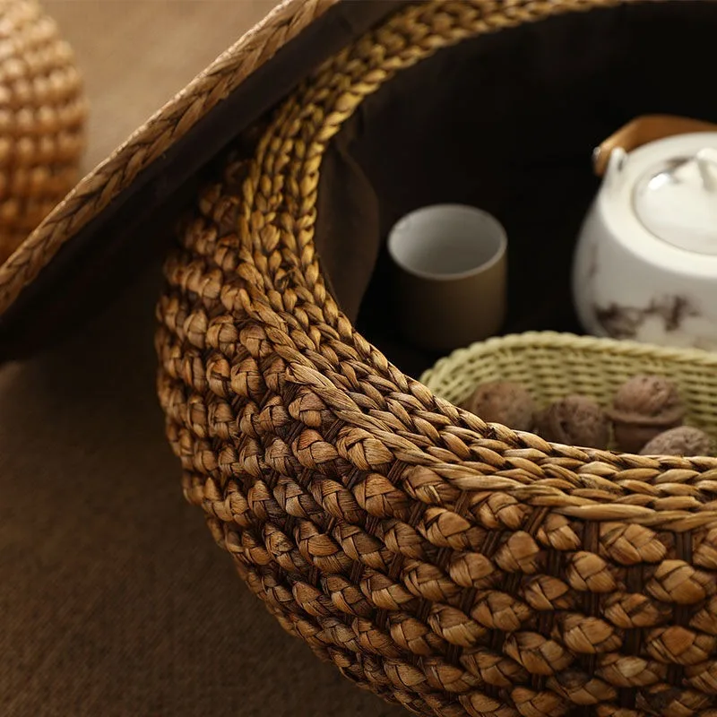 Handgewebter Rattan Kaffeetisch im japanischen Stil – Runder Teetisch mit Stauraum für Ihr Wohnzimmer
