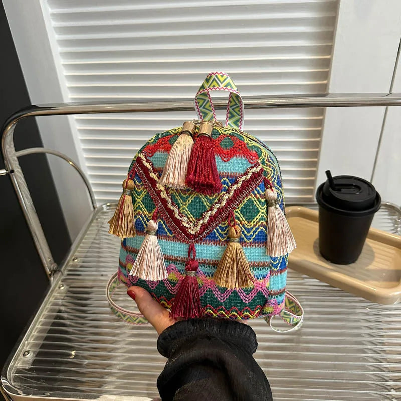 Der Patchwork-Stil und die dekorativen Bänder sowie die Tasseln verleihen dem Rucksack einen einzigartigen, bohemian-inspirierten Look, der zu Ihrem individuellen Stil passt. Ideal für Freizeit- und Reisewünsche, eignet sich dieser Rucksack sowohl für den täglichen Gebrauch als auch für ein entspanntes Wochenende oder Reisen.