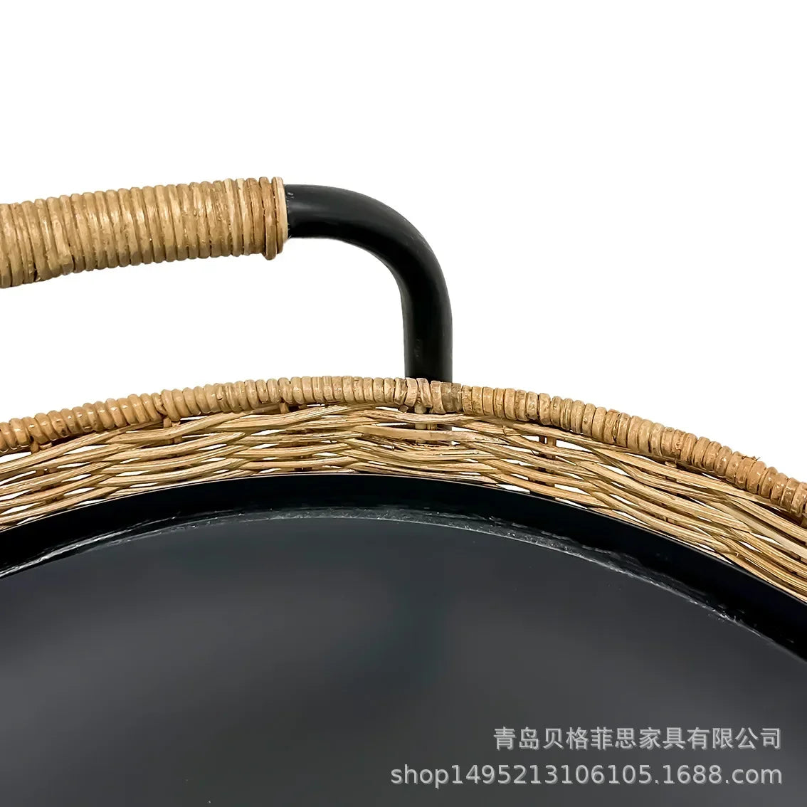 Stilvoller Kaffee-Tisch mit doppelter Rattan-Webung und schwarzem Metallrahmen, vielseitiger Sofa-Beistelltisch mit universellen Roll-Lagern