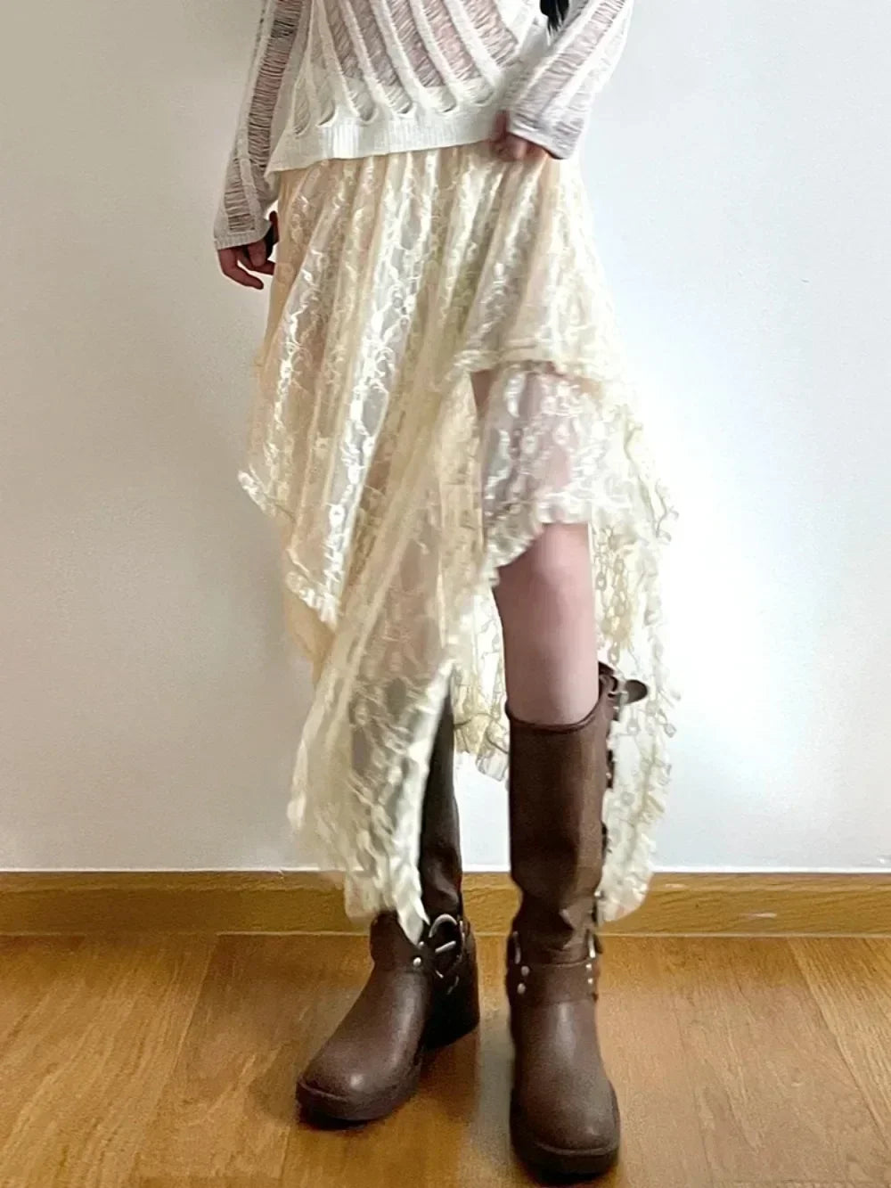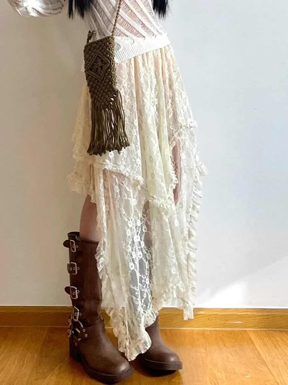 Lace Asymmetrischer Rock für Damen – Vintage Y2K Boho Ästhetik High Waist Mid Rock für Sommer-Urlaubs-Outfits