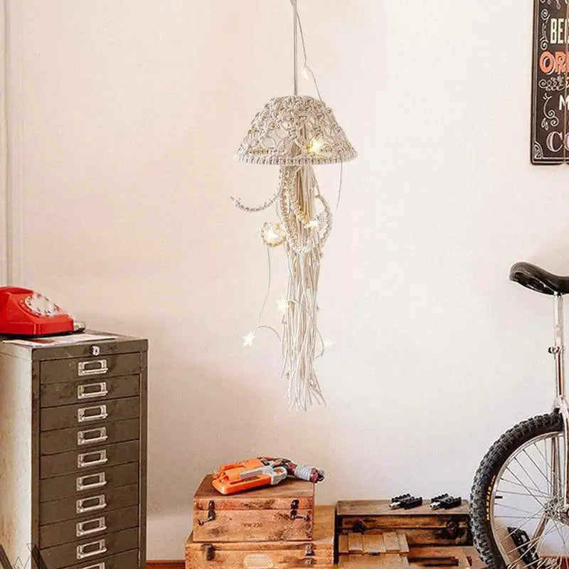 Nordic Macrame Dream Catcher aus Baumwollseil mit Lichterkette – Handgefertigter Wovener Jellyfish Traumfänger für kreative Raumdekoration