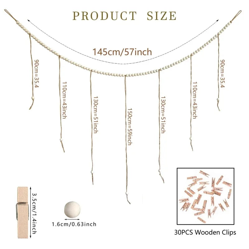 Boho Beaded Photo Display – Wooden Wall Hanging with Clips for Photos, Postcards, and Artworks – Unique Home Decor & Gift Idea